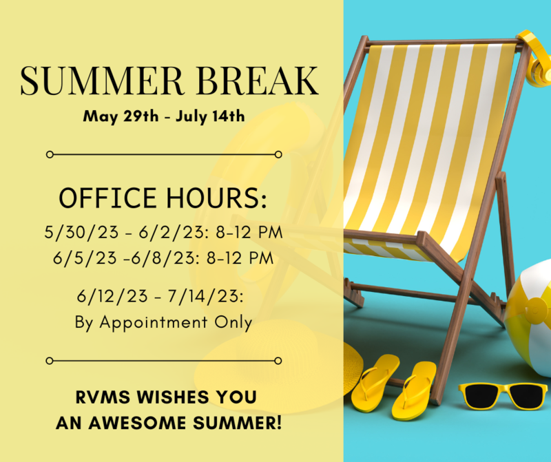The RVMS Front Office will only be open from 8a-12pm on 5/30-6/2 and 6/5-6/8. From 6/12-7/14, please call and leave a message to schedule an appointment.