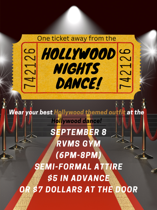 Wear your best Hollywood themed outfit and join us on September 8 for the Hollywood Night Dance in the RVMS gym from 6 PM to 8 PM.